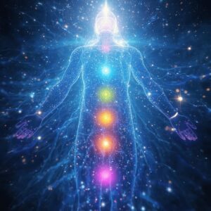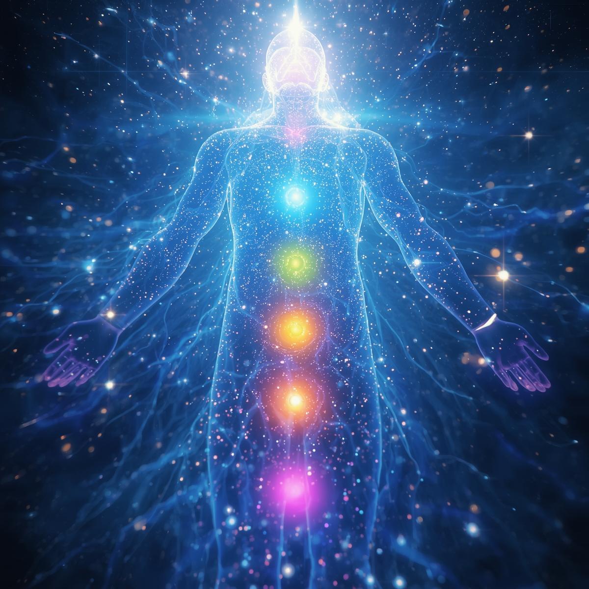 bright sparkling brillinat light moving through the central channel of the human body, glowing chakra points, beautiful cooling glowing colours, expansive, healing, cinematic, highly detailed, epic